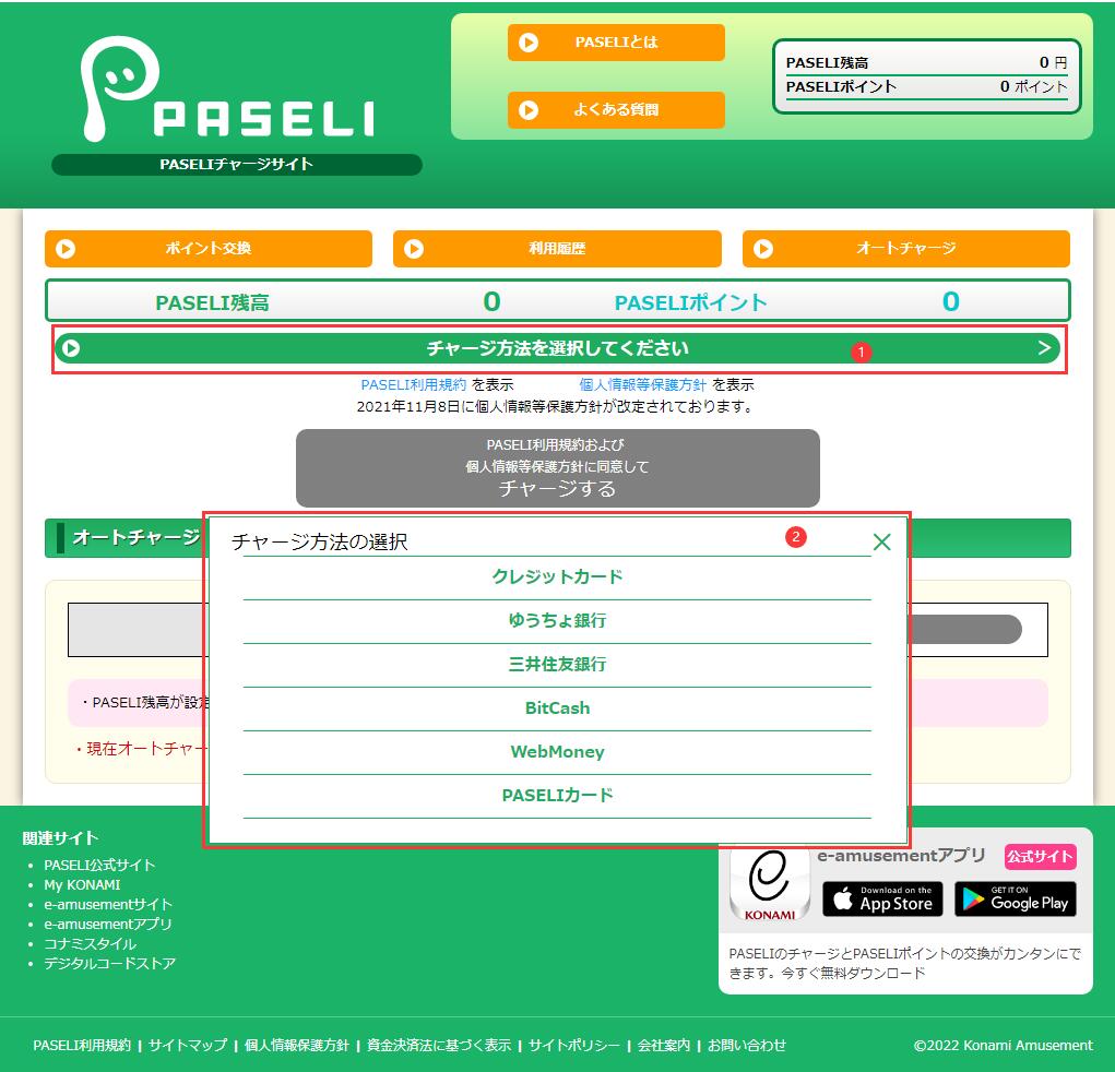 - 打开充值页(https://paseli.konami.net/charge/top.html),注意这个页面中的必要资源由于使用了googleapis的CDN服务,在国内可能无法加载,此时将会卡在接下来的第二步。可以使用国内镜像来解决这个问题,具体请参考这个教程;或者也可以直接炼金术上网。