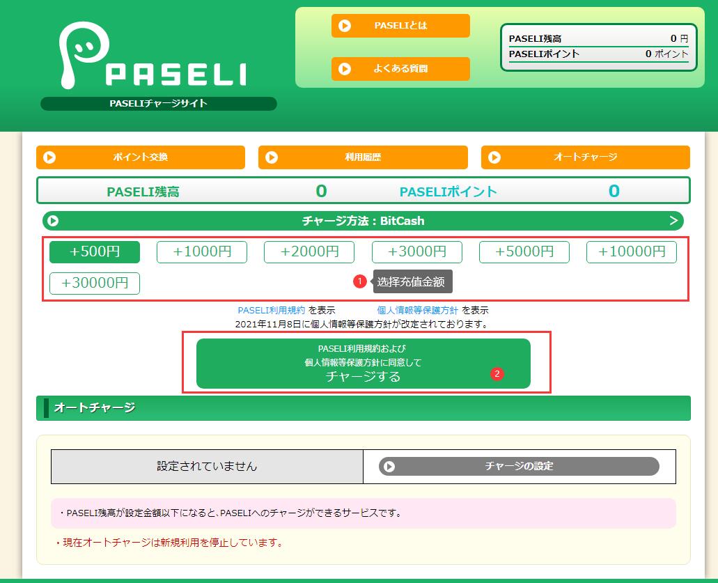 - 选择要充值的金额,然后点击「PASELI利用規約および 個人情報等保護方針に同意して チャージする」