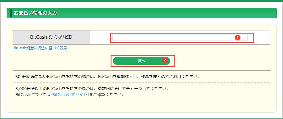 - 将卖家给你的BitCash的16位假名ID复制到输入框中,然后点击「次へ」