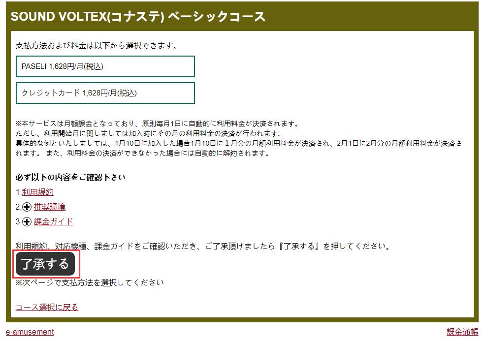 - 前往会员加入页(https://p.eagate.573.jp/payment/p/select_course.html?course=eac_sdvx_basic)。或者你也可以从首页进入,点击右上角的三条横杠打开菜单,选择「コース加入」,在新跳转到的的网页中点击「SOUND VOLTEX(コナステ) ベーシックコース」。
