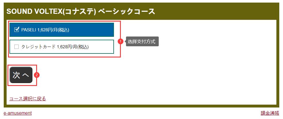 - 选择支付方式,如果之前是按照上一步充值了PASELI的话,这里选择「PASELI 1,628円/月(税込)」。如果选择信用卡支付的话选择「クレジットカード 1,628円/月(税込)」。然后点击「次 へ」。