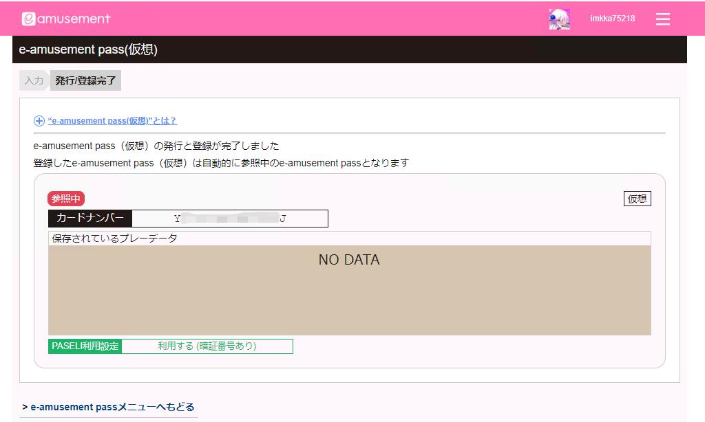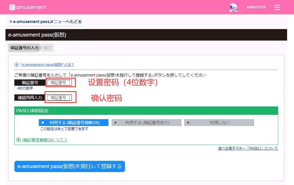 - 输入并确认密码,然后点击「e-amusement pass(仮想)を発行して登録する」。下面那个「PASELI利用設定」是设置使用PASELI消费的时候是否需要密码,可以按需选择是否设置。