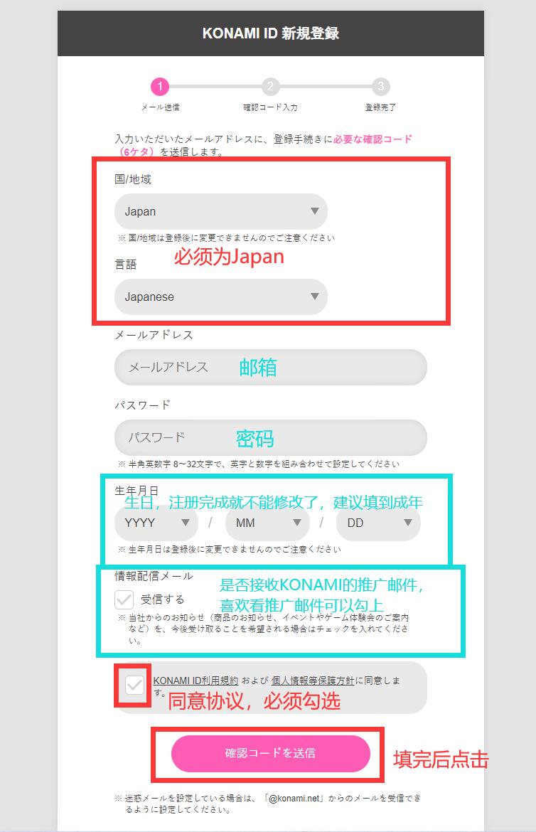 - 填写注册信息,这里区域必须选择「Japan」,其他都是常规信息,图里标注了含义,照着填就可以了,注意密码需要是8~32位之间的英文和数字,不能用符号。填完后点击「確認コードを送信」