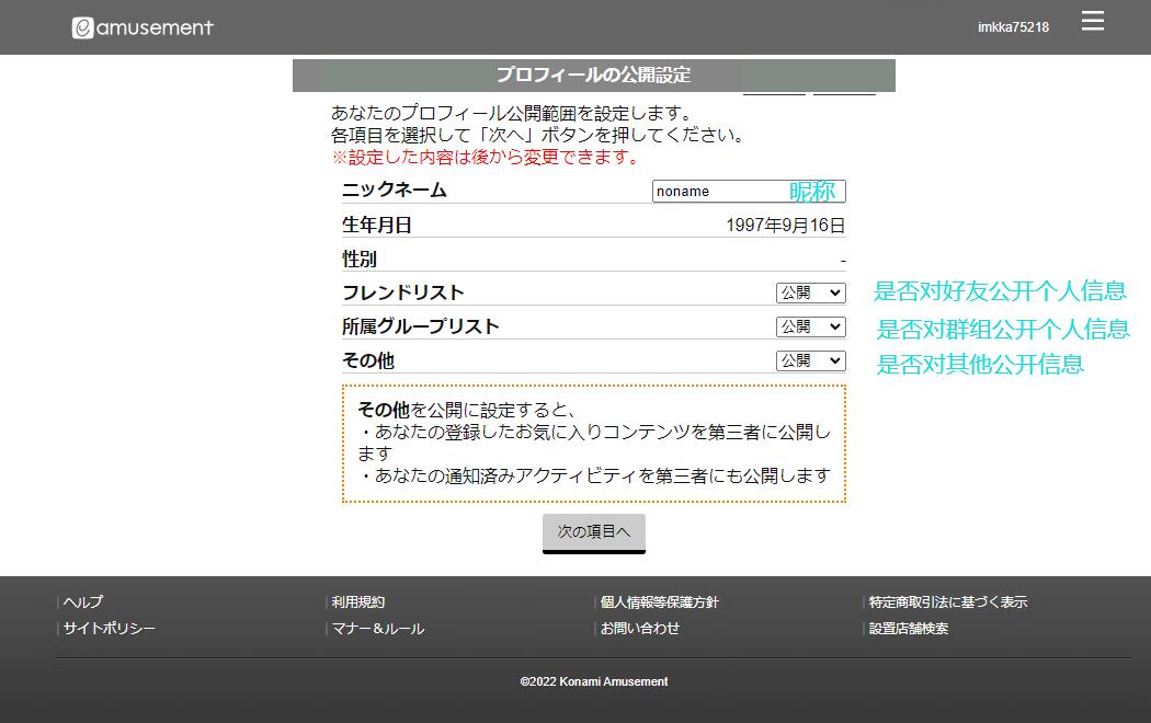 - 在下一个页面继续点击「次へ」,应该会跳转到同意协议的页面,如果没有跳转而是跳到一个错误页,也可以重新打开第1步中的这个网站(https://p.eagate.573.jp/),然后点击「無料登録」上方的「ログイン」手动登录
